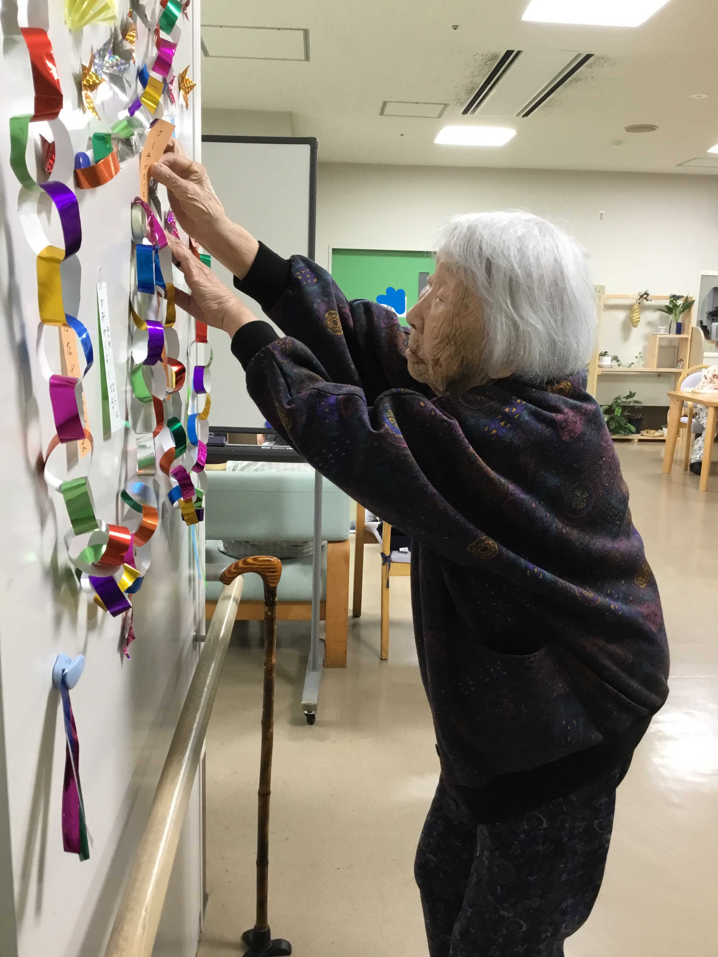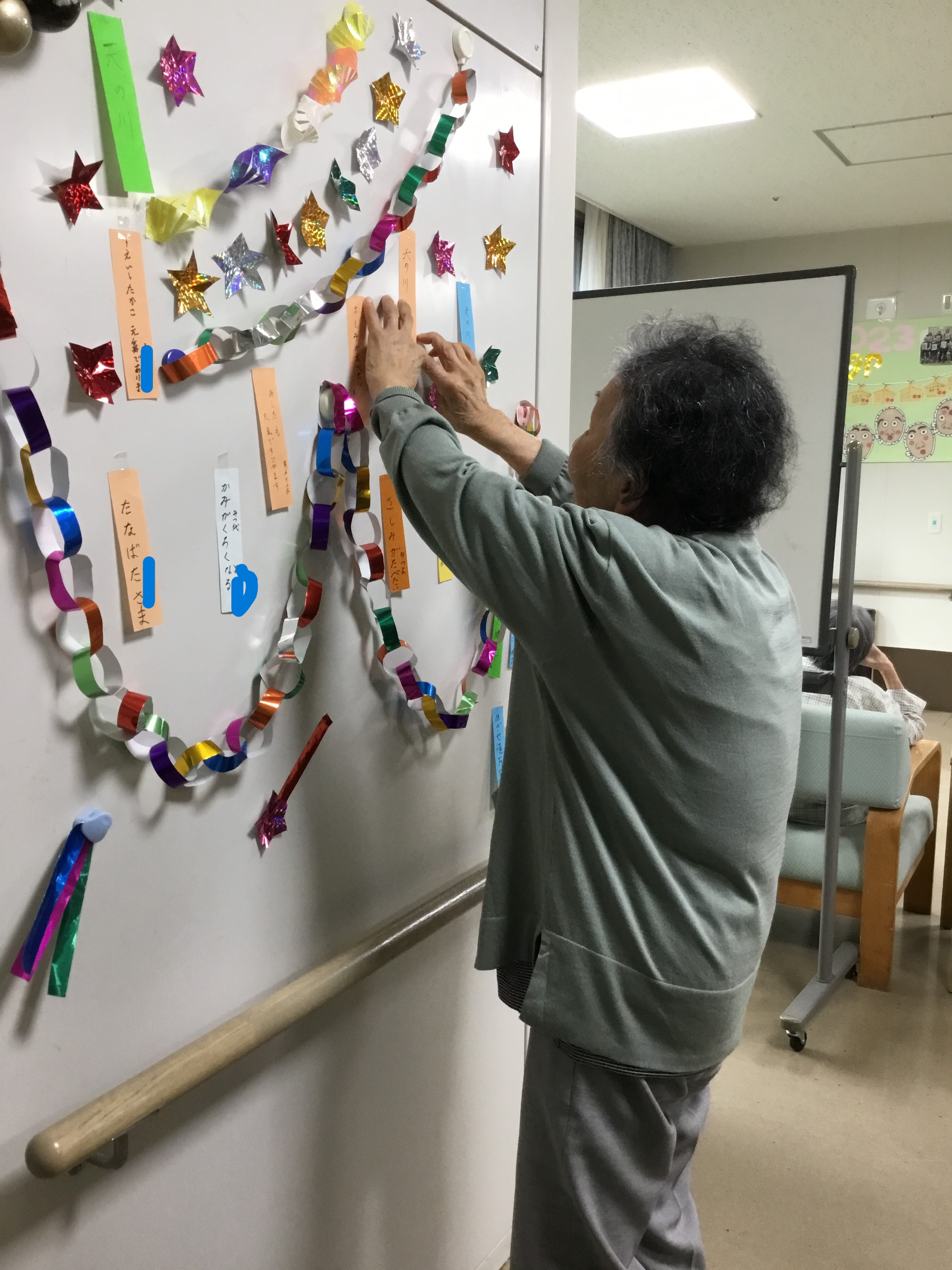 今年は何をお願いされるのかな~「さしみが食べたい」「髪が黒くなりますように」「健康でいれますように」等々を短冊に願いを込めて飾って下さいました。皆様の願いが叶いますように☆彡職員一同より