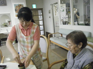 茶道の経験のある職員が立ててくれたお茶、美味しい和菓子を食べながら